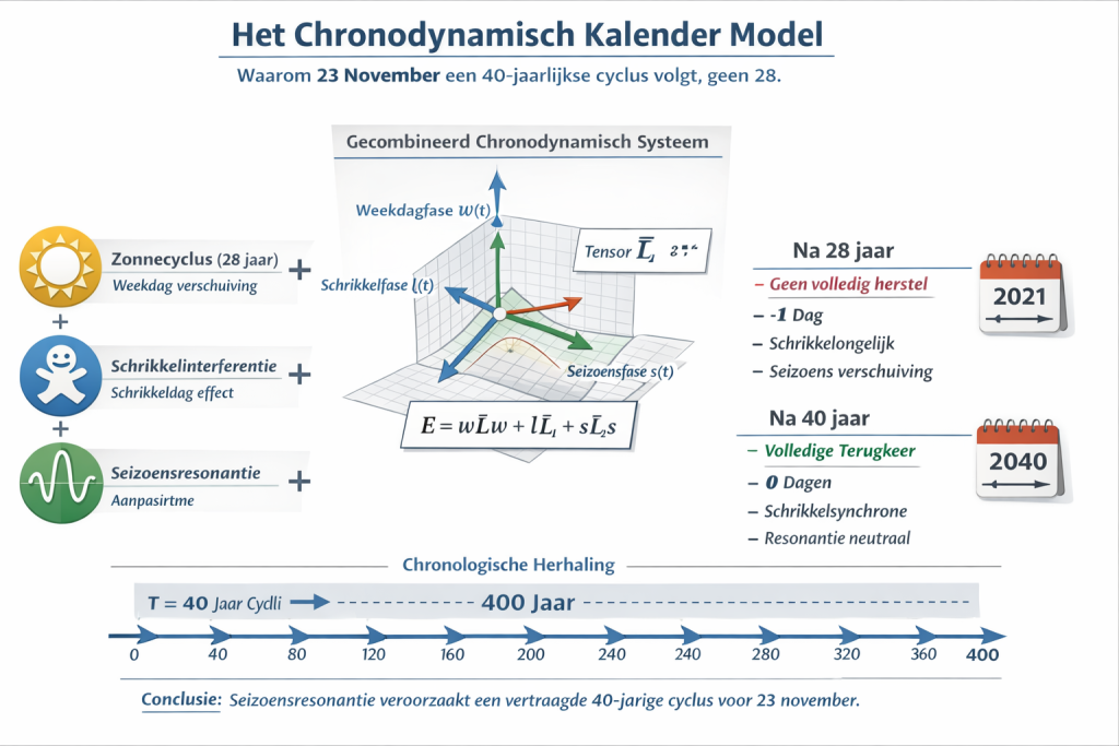 In dit project introduceren wij de Quadragenarian Recurrence Hypothesis (QRH), waarin wordt aangetoond dat de kalenderdatum 23 november slechts eenmaal per 40 jaar voorkomt in identieke chronodynamische configuratie. Door analyse van zonnecycli, schrikkeljaarinterferentie en seizoensresonantie-effecten binnen de Gregoriaanse kalender, tonen wij aan dat conventionele 28-jarige herhalingsmodellen onvoldoende verklaringskracht bezitten voor late-herfstdagen.